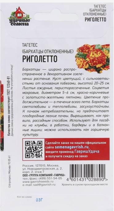 Семена Бархатцы отклоненные (Тагетес) "Риголетто", 0,3 г