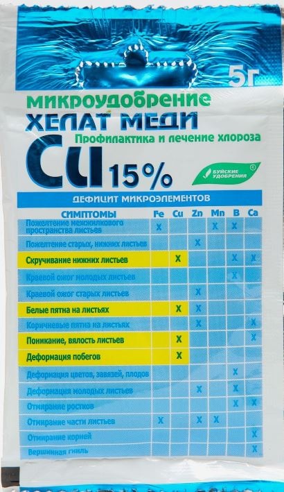 Хелат меди - высокоэффективное экологически чистое водорастворимое микроудобрение в биологически активной форме, применяется для профилактики и лечения болезней и хлороза вызванного дефицитом меди. Медь важна для фотосинтеза, метаболизма белков и углеводов. Под ее влиянием активируются ферменты, предотвращающие разрушение клеток растений. Медь повышает устойчивость растений к грибковым и бактериальным заболеваниям. Способствует устранению отрицательных факторов, вызываемых ее недостатком, лучшему развитию растений, увеличению урожайности и значительному повышению качества продукции.