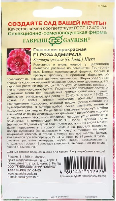 Роскошное и очень модное среди цветоводов комнатное растение из семейства Геснериевые. Цветки колокольчатой формы, белые в красную крапинку, с приятной бархатистой поверхностью венчают длинные цветоносы. Широкоовальные листья на коротких черешках украшают основание цветоноса. На взрослом растении образуется 10-15 крупных цветков, создавая впечатление нарядного букета. Глоксиния предпочитает светлые, солнечные места без воздействия прямых солнечных лучей. Идеальная температура для роста — 20-25°С днем и 18–22°С ночью. Во время цветения необходим обильный полив, еженедельные подкормки, влажный воздух (опрыскивание из пульверизатора). В октябре-ноябре, после цветения, полив и подкормку прекращают. Когда листья глоксинии засохнут, клубни вынимают из почвы и помещают на хранение в неглубокие ящички с чуть влажным песком или перлитом, которые устанавливают в помещении с температурой 10-12°С. После периода покоя (примерно 90 дней) клубни дадут новые ростки и их снова можно будет пересаживать в горшок. Семена на рассаду высевают поверх субстрата (не заделывая в почву) с февраля по март, накрывают стеклом и ставят в теплое, светлое место. Всходы появляются при температуре 22-24°С, через 10-14 дней. В фазе 3-х листьев растения пикируют, через месяц рассаживают в отдельные горшки. Зацветает глоксиния, выращенная из семян через 5-6 месяцев.