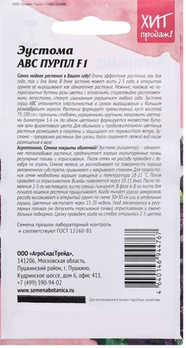 Семена цветов Эустома "АВС Пурпл комнатная", 10 шт