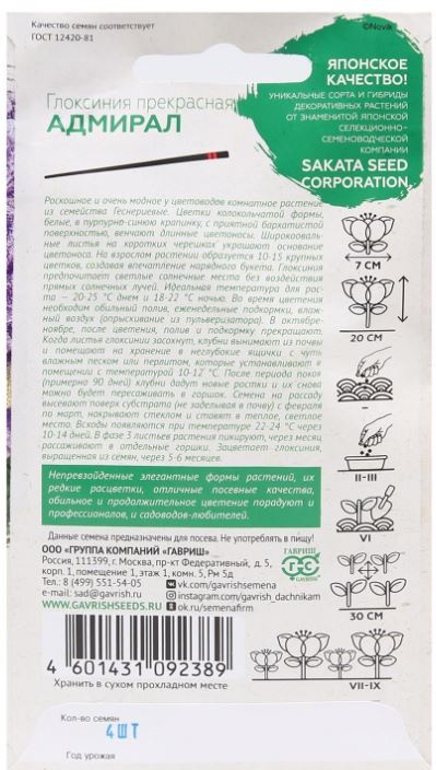 Роскошное и очень модное среди цветоводов комнатное растение из семейства Геснериевые. Цветки колокольчатой формы, белые в синюю крапинку, с приятной бархатистой поверхностью венчают длинные цветоносы. Широкоовальные листья на коротких черешках украшают основание цветоноса. На взрослом растении образуется 10-15 крупных цветков, создавая впечатление нарядного букета. Глоксиния предпочитает светлые, солнечные места без воздействия прямых солнечных лучей. Идеальная температура для роста — 20-25°С днем и 18–22°С ночью. Во время цветения необходим обильный полив, еженедельные подкормки, влажный воздух (опрыскивание из пульверизатора). В октябре-ноябре, после цветения, полив и подкормку прекращают. Когда листья глоксинии засохнут, клубни вынимают из почвы и помещают на хранение в неглубокие ящички с чуть влажным песком или перлитом, которые устанавливают в помещении с температурой 10-12°С. После периода покоя (примерно 90 дней) клубни дадут новые ростки и их снова можно будет пересаживать в горшок. Семена на рассаду высевают поверх субстрата (не заделывая в почву) с февраля по март, накрывают стеклом и ставят в теплое, светлое место. Всходы появляются при температуре 22-24°С, через 10-14 дней. В фазе 3-х листьев растения пикируют, через месяц рассаживают в отдельные горшки. Зацветает глоксиния, выращенная из семян через 5-6 месяцев.