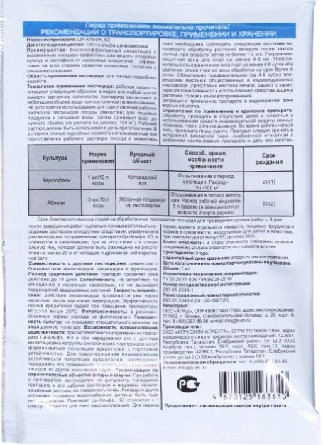 Цм-Альфа ингибирует процессы деполяризации натриевых потенциал-зависимых каналов, что приводит к гипервозбудимости (нокдаун-эффект) и гибели насекомых.Препарат защищает широкий спектр сельскохозяйственных культур.Возможно применение Ци-Альфа в личных подсобных хозяйствах для уничтожения вредителей на картофеле и яблоне.Имеет длительный период защитного действия, что позволяет ограничиться одной обработкой за сезон.Препарат обладает репеллентным действием на пчел, которые сразу после опрыскивания покидают обработанный участок. Эффективен против широкого спектра насекомых вредителей, в основном грызущих, а также некоторых сосущих, при применении на любом этапе развития популяции.Подходит для защиты многих сельскохозяйственных культур.Обладает высокой скоростью токсического воздействия, первые признаки действия препарата заметны в течение одного часа после обработки.Применяется в сравнительно низких нормах расхода и имеет низкую стоимость гектарной обработки.Совместим с большинством фунгицидов, инсектицидов, регуляторов роста, возможно применение в баковых смесях.