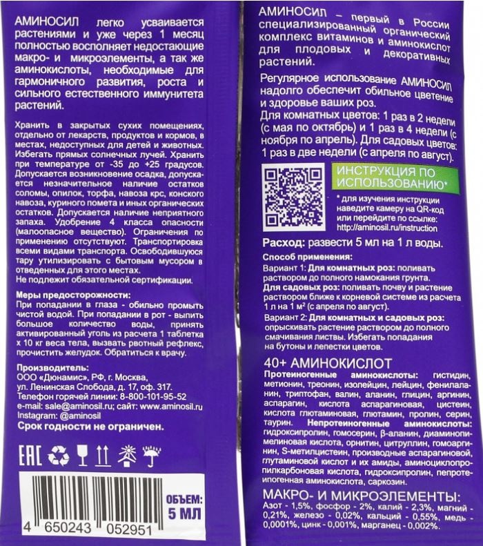 Витамины для роз Аминосил созданы для полноценного сбалансированного питания всех типов роз весной и летом. 100% органический состав. Макро и микроэлементы. 40+ аминокислот.Удобрение для роз содержит все необходимые элементы питания, которые необходимы для здоровья и красоты растений. Подкормка для цветущих обладает уникальной формулой, которая способствует быстрому и здоровому росту цветов и обеспечит пышное продолжительное цветение садовых цветов. Оно содержит все важные макро и микроэлементы, а также натуральные добавки, которые увеличивают количество питательных веществ, необходимых для роста и цветения. Рекомендуется использовать в период активного роста растений и цветения.5 мл витаминного концентрата АМИНОСИЛ для роз разбавить в 1 л воды до образования однородного раствора.Вариант 1:• Для комнатных роз - поливать почву и растение получившимся раствором ближе к основанию до полного намокания грунта;• Для садовых роз - поливать почву и растение получившимся раствором ближе к корневой системе из расчета 1 л на 1 м².Вариант 2:Опрыскивать растение полученным раствором с помощью пульверизатора до полного смачивания листвы. Избегать попадания на бутоны и лепестки цветов.Периодичность:• Для комнатных роз 1 раз в 2 недели (с мая по октябрь) и 1 раз в 4 недели (с ноября по апрель);• Для садовых роз 1 раз в 2 недели (с апреля по август). Наилучший органический состав для роз;Накопительный эффект, который постоянно усиливает иммунитет растения и улучшает зимостойкость;Обеспечивает пышное продолжительное цветение;