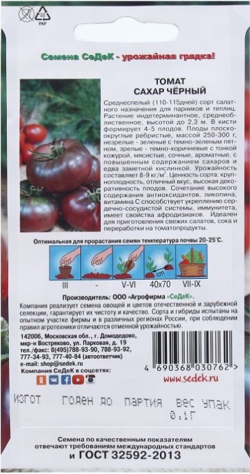 Среднеспелый (110-115 дней) сорт салатного назначения для парников и теплиц. Растение индетерминантное, среднеоблиственное, высотой до 2,3 м. В кисти формирует 4-5 плодов. Плоды плоскоокруглые ребристые, массой 250-300 г, незрелые - зеленые с темно-зеленым пятном, зрелые - темно-коричневые с тонкой кожурой, мясистые, сочные, ароматные, с повышенным содержанием сахаров и едва заметной кислинкой. Урожайность составляет 8-9 кг/м2.