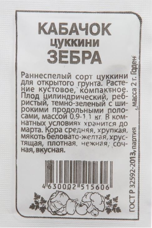 Раннеспелый сорт цуккини для открытого грунта. Растение кустовое, компактное. Плод цилиндрический, ребристый, темно-зеленый с широкими продольными светло-зелеными полосами, массой 0,9-1,1 кг. В комнатных условиях хранится до марта. Кора средняя, хрупкая, мякоть беловато-желтая, хрустящая, плотная, нежная, сочная, вкусная. Семена сеют непосредственно в грунт,  Для получения ранней продукции кабачки сеют на рассаду поздней весной, за две-три недели до высадки. Схема посадки 100х100 см, глубина заделки семян 3-5 см. При раннем посеве или посадке рассады в открытый грунт необходимо временное укрытие пленкой. Для получения наиболее высокого урожая рекомендуется регулярно проводить рыхление почвы и умеренные поливы. В период цветения-налива плодов рекомендуется провести подкормку комплексными минеральными удобрениями. Сбор урожая по мере созревания плодов. Не требует формировки.
