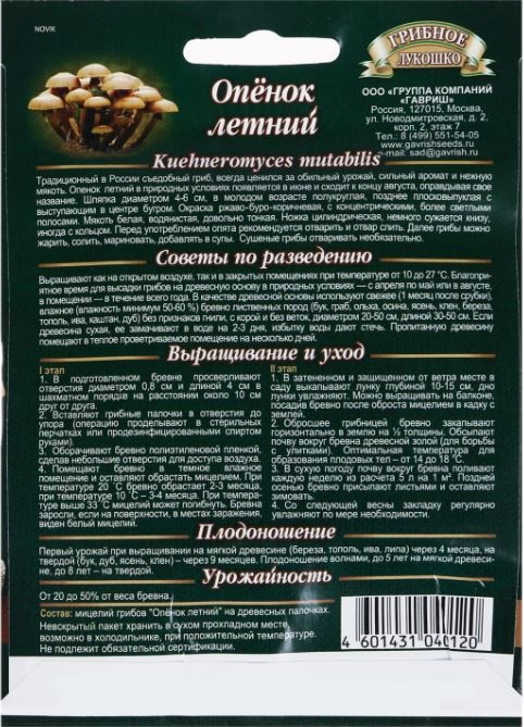 Плодоношение: Первый урожай при выращивании на мягкой древесине (береза, тополь, ива, липа) через 4 месяцев, на твердой (бук, дуб, ясень, клен) – через 9 месяцев. Плодоношение волнами до 5 лет на мягкой древесине, до 8 лет на твердой. Урожайность: От 20 до 50% от веса бревна. Состав: Мицелий грибов "Опенок летний" на древесных палочках. Невскрытый пакет хранить в сухом прохладном месте, возможно в холодильнике при положительной температуре.