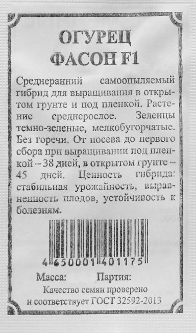 Среднеранний (от всходов до созревания плодов проходит 45-50 дней) партенокарпический (не требует опыления) гибрид для выращивания в открытом грунте и под пленочными укрытиями. Растение среднерослое. Плоды цилиндрические, темно-зеленые, с полосами средней длины, плотные, мелкобугорчатые, с белым опушением, длиной 9-11 см, массой 55-70 г. Достоинства гибрида: отличный вкус свежих и консервированных зеленцов, стабильная урожайность, устойчивость к основным заболеваниям огурцов. Урожайность 4-5 кг/м2. Выращивают рассадным способом или прямым посевом в открытый грунт.