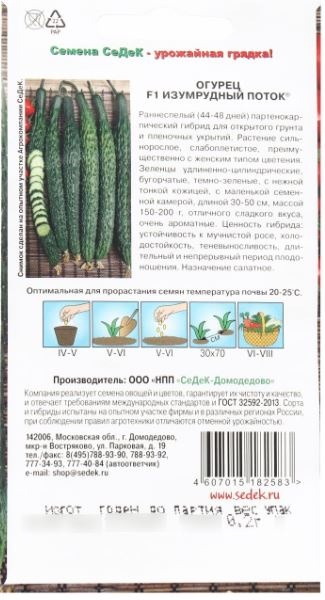 Плоды "Изумрудного потока" обладают насыщенным зеленым окрасом с приятным блеском, что придает им свежий и аппетитный внешний вид. Благодаря своей удлиненной цилиндрической форме и средним размерам, огурчики идеально подходят как для свежего потребления, так и для различных кулинарных заготовок.Отличительной особенностью гибрида является его высокая урожайность и скороспелость. Уже через 40-45 дней после всходов вы сможете собирать первый урожай этих замечательных овощей. При правильном уходе и выращивании каждое растение способно дать до 15-20 кг отменных плодов.Гибрид "Изумрудный поток" порадует вас своей неприхотливостью и устойчивостью к основным болезням и вредителям. Он прекрасно подходит для выращивания в открытом грунте, парниках и теплицах.