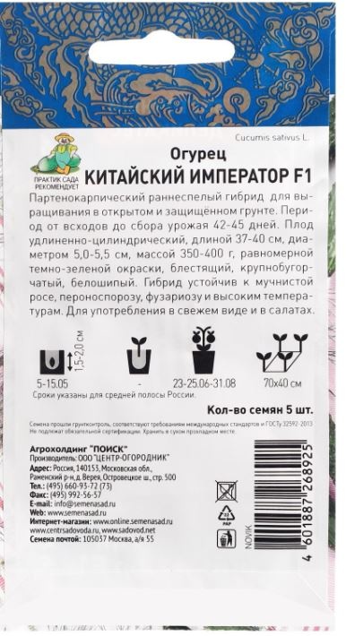Огурцы "Китайский император" отличаются не только своей внешней красотой, но и непревзойденными вкусовыми качествами. Их мякоть поражает своей хрустящей текстурой и ярким, освежающим ароматом. Идеальны как в свежем виде, так и в различных кулинарных рецептах. Этот сорт F1 гарантирует вам стабильно высокие урожаи и отличное качество плодов. Приобретая набор из 5 шт., вы сможете насладиться всей палитрой вкусов и ароматов этого удивительного овоща. Откройте для себя восточную роскошь с огурцами "Китайский император" - истинным воплощением гармонии и изящества!