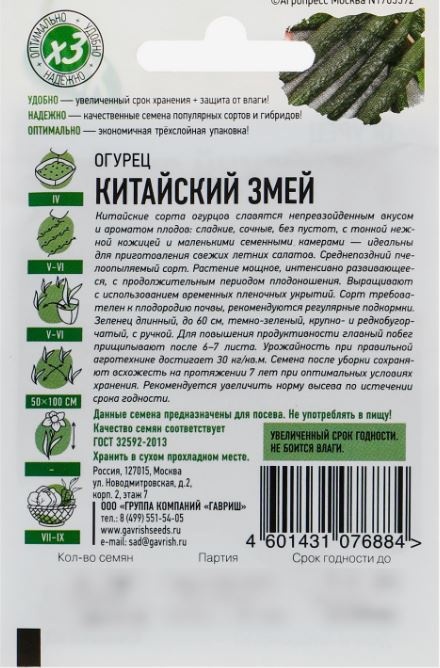 Китайские сорта огурцов славятся непревзойденным вкусом и ароматом плодов: сладкие, сочные, без пустот, с тонкой нежной кожицей и маленькими семенными камерами — идеальны для приготовления свежих летних салатов. Гибрид среднепоздний, пчелоопыляемый. Растение мощное, интенсивно развивающееся, с продолжительным периодом плодоношения. Выращивают с использованием временных пленочных укрытий. Гибрид требователен к плодородию почвы, рекомендуются регулярные подкормки. Зеленец длинный, до 60 см, темно-зеленый, крупно- и редкобугорчатый, с ручкой. Посев на рассаду — в конце апреля. Высадка рассады в грунт — в конце мая–начале июня в фазе 3—4-х настоящих листьев. Посев непосредственно в грунт — в мае–июне. Схема посадки: 50x100 см. Для повышения продуктивности главный побег прищипывают после 6–7 листа. Урожайность при правильной агротехнике достигает 30,0 кг/м2. Семена после уборки сохраняют всхожесть в течение 7 лет при оптимальных условиях хранения. Рекомендуется увеличить норму высева по истечении срока годности.