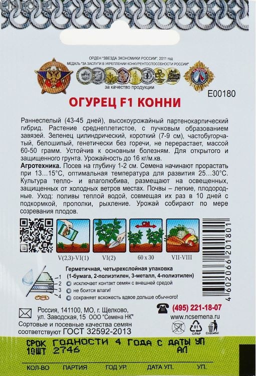 Посев рассады в конце апреля. Высадка в грунт в конце мая — начале июня в фазе 3–4 настоящих листьев. Посев непосредственно в грунт в мае — июне. Схема посадки: 30 × 70 см. Гибрид устойчив к мучнистой росе и корневым гнилям. Ценится за высокое качество вкусных, ароматных плодов. Благодаря короткоплодности, очень удобен для засолки и маринования. Товарная урожайность: 12,6–16 кг/м².