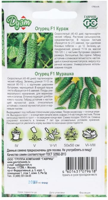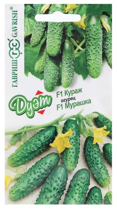 Семена огурцов "Кураж"Этот сорт огурцов гарантирует обильный урожай ароматных, хрустящих плодов насыщенно-зелёного цвета. Растение отличается повышенной устойчивостью к заболеваниям и неблагоприятным погодным условиям. Плоды "Кураж" имеют идеальную форму, бугорчатую текстуру и тонкую горьковатую кожицу, которая сохраняет свежесть и хрустящую консистенцию даже при длительном хранении. Огурцы "Кураж" прекрасно подходят как для свежего потребления, так и для консервирования. Их можно использовать в салатах, для заготовок на зиму, а также для фаршировки и приготовления различных блюд.Семена огурцов "Мурашка"Этот сорт поражает своей урожайностью и скороспелостью. Растение отличается компактными размерами и обильным плодоношением. Плоды "Мурашка" небольшого размера, тёмно-зелёного цвета с белыми полосками. Они идеально подходят для консервирования и малосольных заготовок. Огурцы "Мурашка" обладают насыщенным вкусом с лёгкой кислинкой и отменной хрустящей текстурой. Благодаря высокой устойчивости к болезням и вредителям, этот сорт прекрасно подойдёт для выращивания в открытом грунте и в теплицах.Серия "Дуэт" - это коллекция отборных сортов огурцов с великолепными вкусовыми качествами и высокой урожайностью. Семена "Кураж" и "Мурашка" гарантируют обильный и длительный сезон свежих овощей на вашем столе!