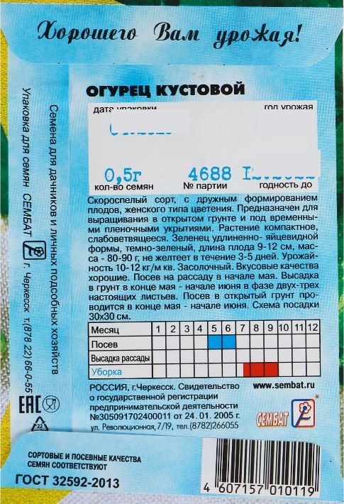 Раннеспелый пчелоопыляемый сорт для открытого грунта. Женского типа цветения. Растение компактной формы, главная плеть короткая (от 35 до 60 см). Благодаря коротким плетям и кустовой форме растений, сорт очень удобен для выращивания на небольших огородах, т.к. упрощается уход и облегчается сбор урожая. Зеленец удлинённо-яйцевидный, с бугорчатой поверхностью, длиной 9-12см, массой 110-130г., имеют темно-зеленый оттенок и черное опушение. Эти огурцы не покрываются оливковой пятнистостью, слабо поражаются бактериозом и устойчивы к мучнистой россе. Их идеальное вкусовое качество делает их отличным продуктом для использования в свежем виде, а также для соления и маринования. Они не желтеют и у них отсутствует привкус горечи.
