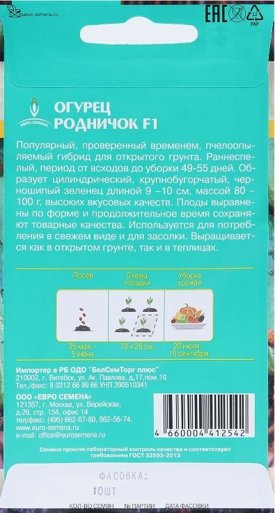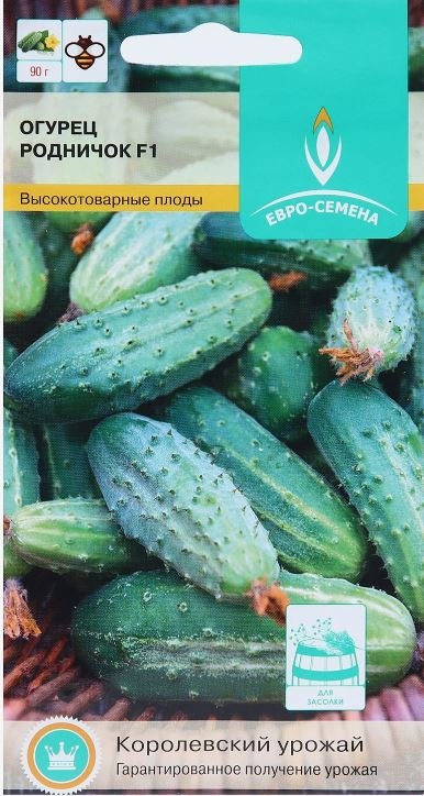 Семена Огурец Родничок F1. Среднеранний (от всходов до плодоношения 40-48 дней) пчелоопыляемый гибрид преимущественно женского типа цветения, предназначен для выращивания в открытом грунте и под временными пленочными укрытиями. Зеленец цилиндрический, слегка вытянутый к основанию, зеленый со светлыми полосами, черно- и буро-шипый, среднебугорчатый, длиной 9-10 см, массой 80-100 г. Плоды выровнены по форме и продолжительное время сохраняют товарные качества. Вкусовые качества отличные. Пригоден для засолки и консервирования. Плотность посадки 4-5 раст./м2. Урожайность до 5 кг/раст.