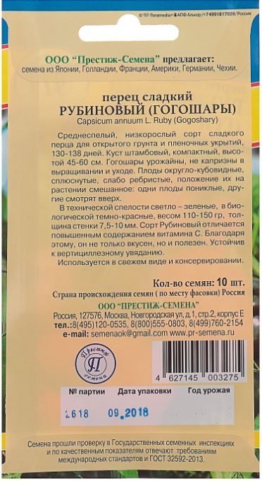 Компактное, штамбовое, густооблиственное растение со смешанным расположением плодов. Высота куста может достигать 60 см. урожайность высокая – 3,5-5 кг/кв. м. Среднеспелый сорт созревания. Плоды крупные, сочные, мясистые – пригодны для салатной нарезки и консервации. Перец Рубиновый отличается мясистой и сочной стенкой плода. Средняя толщина стенки – 1 см.Это лидер по вкусовым качествам и внешним характеристикам. Необычная форма, аромат и цвет перца делает его украшением любого стола. Рубиновый отличается большим содержанием витамина С. Средняя масса плодов – 160 г. Посев рассады осуществляю в контейнеры. Через 20-25 дней рассаду пикируют. Через 1,5-2 месяца после первых всходов рассаду пересаживают в открытый грунт. Для ускорения созревания плодов побеги прищипывают. Растение требует частого полива, не любит попадания прямых солнечных лучей.