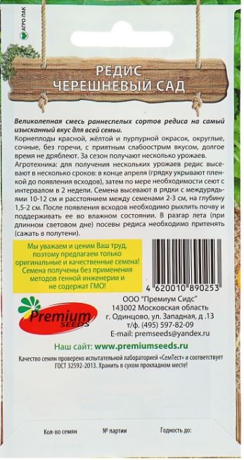 Агротехника: для получения нескольких урожаев редис высевают в несколько сроков: в конце апреля (грядку укрывают пленкой до появления всходов), затем по мере необходимости сеют с интервалом в 2 недели. Семена высевают в рядки с междурядьями 10-12 см и расстоянием между семенами 2-3 см, на глубину 1,5-2 см. После появления всходов необходимо рыхлить почву и поддерживать ее во влажном состоянии. В разгар лета (при длинном световом дне) посевы редиса необходимо притенять (сажать в полутени).