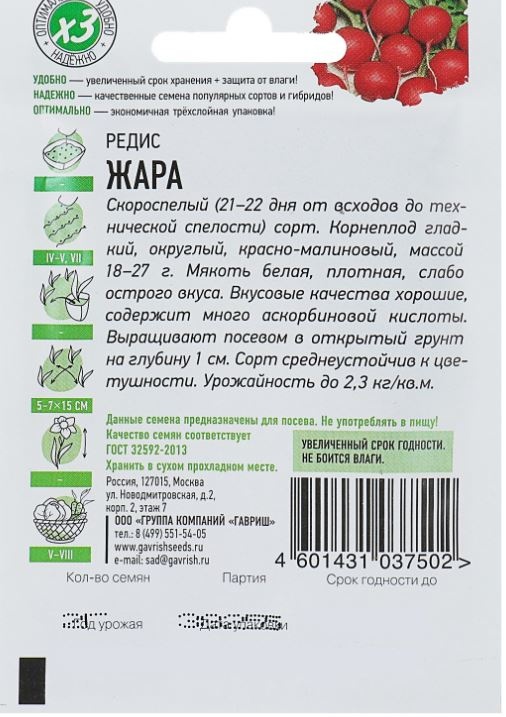 Скороспелый (21-22 дня от всходов до технической спелости) сорт. Корнеплод гладкий, округлый, красно-малиновый, массой 18-27 г. Мякоть белая, плотная, нежная, сочная, слабоострого вкуса. Вкусовые качества хорошие, содержит много аскорбиновой кислоты. Сорт среднеустойчив к цветушности. Выращивают посевом в открытый грунт на глубину 1 см. Урожайность до 2,8 кг/м2.