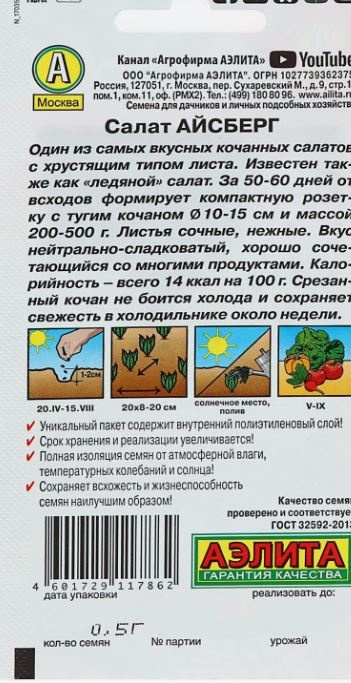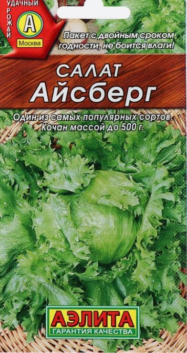 дин из самых вкусных салатов с хрустящим типом листа. Известен также как «ледяной» салат, или «криспхед». За 50-60 дней от всходов формирует компактную розетку с тугим кочаном Ø 10 - 15 см и массой 200-500 г. Листья в кочане широкие, сочные, нежные; богаты витаминами, минералами и клетчаткой. Вкус нейтрально-сладковатый, хорошо сочетающийся со многими продуктами. Калорийность – всего 14 ккал на 100 г.