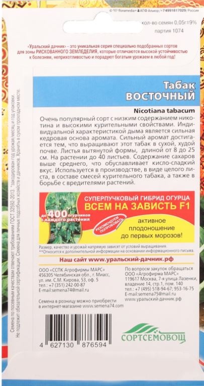 Очень популярный сорт с низким содержанием никотина и высокими курительными свойствами. Индивидуальной характеристикой дыма является сильная кедровая основа аромата. Сильный аромат достигается тем, что выращивают этот табак в сухой, худой почве. Листья вытянутой формы, длиной от 8 до 25 см. На растении до 40 листьев. Содержание сахаров выше среднего, что обуславливает кисло-сладкий вкус. Используется в производстве, в виде целого листа, в составе смесей курительного табака, а также в борьбе с вредителями растений.