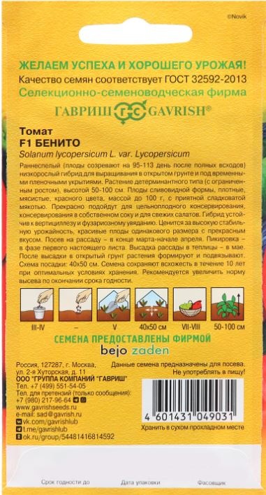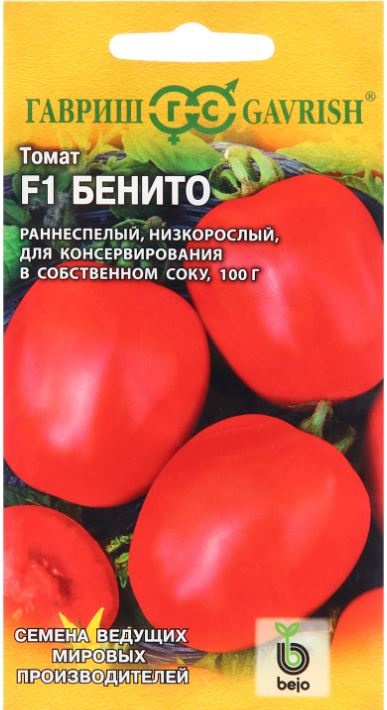 Томат Бенито F1 – ранний, высокоурожайный гибрид, детерминантного типа выведенный селекционерами нидерландской компании Bejo Zaden. Предназначен для высаживания в открытом грунте. Растение кустовое, низкорослое с крепким стеблем и хорошо развитой корневой системой. Рекомендуется подвязывать куст к опоре, чтобы он не завалился под тяжестью плодов. Гибрид не подвергается заболеваниям столбуром и вершинной гнилью. Светолюбивая культура.