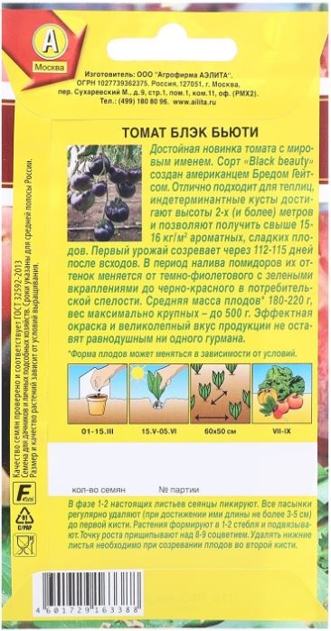 Достойная новинка томата с мировым именем. Сорт «Black beauty» создан американцем Бредом Гейтсом. Отлично подходит для теплиц, индетерминантные кусты достигают высоты 2-х (и более) метров и позволяют получить свыше 15-16 кг/ м 2 ароматных, сладких плодов. Первый урожай созревает через 112-115 дней после всходов. В период налива помидоров их оттенок меняется от темно-фиолетового с зелеными вкраплениями до черно-красного в потребительской спелости. Средняя масса плодов* 180-220 г, вес максимально крупных – до 500 г. Эффектная окраска и великолепный вкус продукции не оставят равнодушным ни одного гурмана.