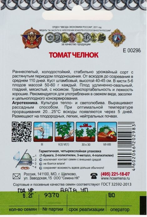 «Челнок» — раннеспелый высокоурожайный сорт помидора. От посева семян до образования плодов проходит 95–110 дней. Куст детерминантный, очень компактный, штамбового типа. Размер взрослого растения не превышает 50 см. Количество зелёной массы среднее, куст не требует формирования и пасынкования. На ветках образуется по 6–10 завязей, созревание плодов идёт постепенно, в течение всего лета.