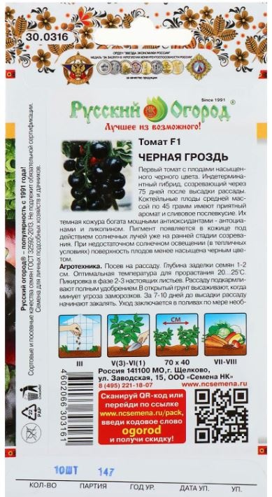 Раннеспелый индетерминантный гибрид, созревающий через 75 дней после всходов. Первый томат с плодами насыщенного черного цвета! Коктейльные плоды массой по 35-70 грамм каждый имеют приятный аромат и сливовое послевкусие. Их темная кожура богата мощными антиоксидантами - антоцианами и ликопином. Пигмент появляется в кожице под действием солнечных лучей уже на ранней стации созревания. При недостаточном солнечном освещении (в тепличных условиях) поверхность плодов менее насыщена черным цветом.