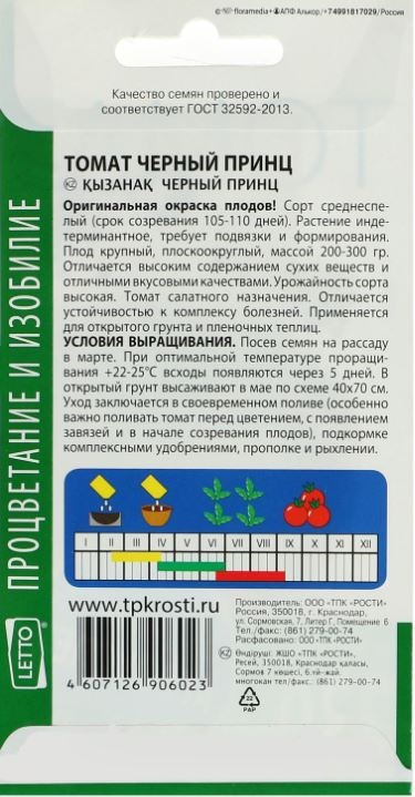Семена «Томат Чёрный принц», 0,1 г — среднеспелый сорт (110–115 дней от всходов до плодоношения). Рекомендован для открытого грунта (с подвязкой к кольям), остеклённых и плёночных теплиц.