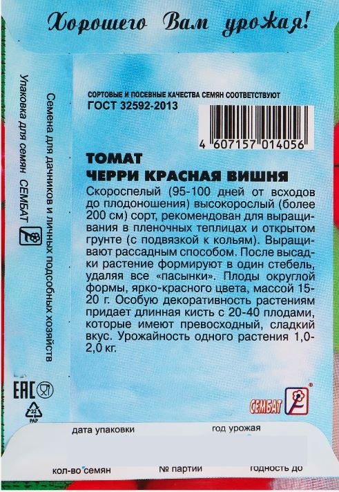 Раннеспелый сорт. Сорт отличается великолепным вкусом плодов и их декоративностью. Растение характеризует высокая урожайность, а также высокорослость (куст является индетерминантным). Нештамбовый куст вырастает до двух метров в высоту. По виду довольно раскидистый. Растение необходимо подвязывать срезу после высадки рассады. Также куст нуждается в прищипывании и формировании. Оптимально формировать стебель в один ствол, в крайнем случае, в два.  Маленькие аккуратные плоды весом 15-30 г с гладкой кожицей имеют очень приятный и сладкий вкус. Цвет красный. Для товарного использования и транспортировки, а также длительного хранения этот сорт черри не предназначен. Зато его очень хорошо использовать свежим и консервировать целиком.