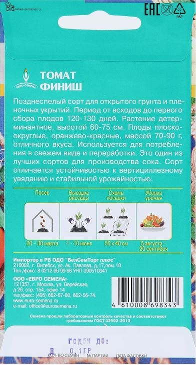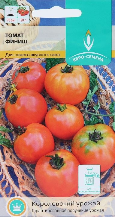 Семена «Томат Финиш», низкорослый, 0,1 г — позднеспелый сорт для открытого грунта и плёночных укрытий. Период от всходов до первого сбора плодов — 120–130 дней. Растение детерминантное, высотой 60–75 см. Плоды плоскоокруглые, оранжево-красные, массой 70–90 г, отличного вкуса.