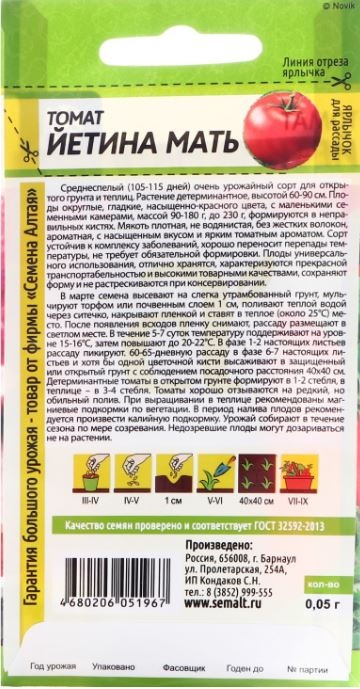 Среднеспелый (105-115 дней) очень урожайный сорт для открытого грунта и теплиц. Растение детерминантное, высотой 60-90 см. Плоды округлые, гладкие, насыщенно-красного цвета, с маленькими семенными камерами, массой 90-180 г, до 230 г, формируются в неправильных кистях. Мякоть плотная, не водянистая, без жестких волокон, ароматная, с насыщенным вкусом и ярким томатным ароматом. Сорт устойчив к комплексу заболеваний, хорошо переносит перепады температуры, не требует обязательной формировки. Плоды универсального использования, отлично хранятся, характеризуются прекрасной транспортабельностью и высокими товарными качествами, сохраняют форму и не растрескиваются при консервировании. В марте семена высевают на слегка утрамбованный грунт, мульчируют торфом или почвенным слоем 1 см, поливают теплой водой через ситечко, накрывают пленкой и ставят в теплое (около 25°С) место. После появления всходов пленку снимают, рассаду размещают в светлом месте. В течение 5-7 суток температуру поддерживают на уровне 15-16°С, затем повышают до 20-22°С. В фазе 1-2 настоящих листьев рассаду пикируют. 60-65-дневную рассаду в фазе 6-7 настоящих листьев и хотя бы одной цветочной кисти высаживают в защищенный или открытый грунт с соблюдением посадочного расстояния 40х40 см. Детерминантные томаты в открытом грунте формируют в 1-2 стебля, в теплице – в 3-4 стебля. Томаты хорошо отзываются на редкий, но обильный полив. При выращивании в теплице рекомендованы магниевые подкормки по вегетации. В период налива плодов рекомендуется произвести калийную подкормку. Урожай собирают в течение сезона по мере созревания. Недозревшие плоды могут дозариваться не на растении.