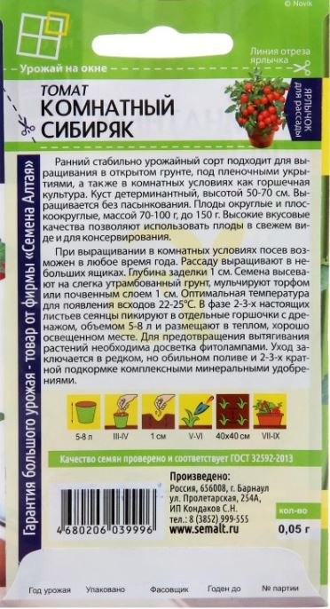 Ранний стабильно урожайный сорт подходит для выращивания в открытом грунте, под пленочными укрытиями, а так же в комнатных условиях как горшечная культура. Куст детерминантный, высотой 50-70 см. Выращивается без пасынкования. Плоды округлые и плоскоокруглые, массой 70-100 г, до 150 г. Высокие вкусовые качества позволяют использовать плоды в свежем виде и для консервирования. При выращивании в комнатных условиях посев возможен в любое время года. Рассаду выращивают в небольших ящиках. Глубина заделки 1 см. Семена высевают на слегка утрамбованный грунт, мульчируют торфом или почвенным слоем 1 см. Оптимальная температура для появления всходов 22-25°С. В фазе 2-3-х настоящих листьев сеянцы пикируют в отдельные горшочки с дренажом, объемом 5-8 л и размещают в теплом, хорошо освещенном месте. Для предотвращения вытягивания растений необходима досветка фитолампами. Уход заключается в редком, но обильном поливе и 2-3-х кратной подкормке комплексными минеральными удобрениями.