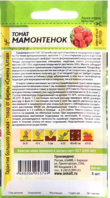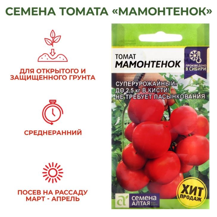 реднеранний (100-105 дней) сорт для открытого и защищенного грунта. Растение детерминантное, высотой 1-1,2 м в открытом грунте и до 1,5 м в теплице, прекращает свой рост после формирования 6 плодовых кистей. Плоды насыщенно-красные, глянцевые, округлые, слегка уплощенные, массой 120-170 г, отдельные плоды могут достигать 350 г. Мякоть обладает ярким ароматом и гармоничным сладким вкусом с кислинкой. Плоды формируются в неправильных кистях массой до 2,5 кг; созревание дружное, за сезон с растения можно получить до 15 кг плодов! Сорт не требует формирования, хорошо устойчив к ряду заболеваний, в том числе фитофторозу, подходит для выращивания как в северных, так и в южных регионах. В марте семена высевают на слегка утрамбованный грунт, мульчируют торфом или почвенным слоем 1 см, поливают теплой водой через ситечко, накрывают пленкой и ставят в теплое (около 25°С) место. После появления всходов пленку снимают, рассаду размещают в светлом месте. В течение 5-7 суток температуру поддерживают на уровне 15-16°С, затем повышают до 20-22°С. В фазе 1-2 настоящих листьев рассаду пикируют. 60-65-дневную рассаду в фазе 6-7 настоящих листьев и хотя бы одной цветочной кисти высаживают в защищенный или открытый грунт с соблюдением посадочного расстояния 40х40 см. Детерминантные томаты в открытом грунте формируют в 1-2 стебля, в теплице – в 3-4 стебля. Томаты хорошо отзываются на редкий, но обильный полив. При выращивании в теплице рекомендованы магниевые подкормки по вегетации. В период налива плодов рекомендуется произвести калийную подкормку. Урожай собирают в течение сезона по мере созревания. Недозревшие плоды могут дозариваться не на растении.