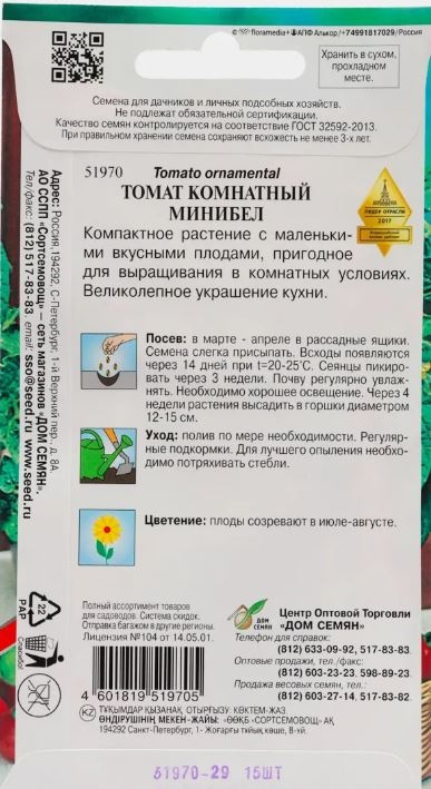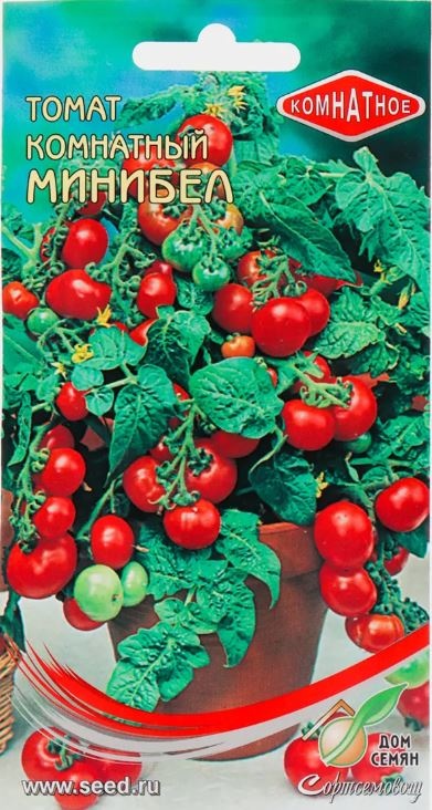 Томат Минибел – описание: Сегментация – скороспелый сорт (89-100 дней) декоративного комнатного томата. Назначение – Предназначен для выращивания в открытом грунте, а также в комнатных условиях – на окнах, балконах. Характеристика плодов – Плоды многочисленные, небольшие, весом от 15 до 25 г. Особенности растения – Высота растения от 30 до 40 см, имеет компактную форму. Рекомендации – Семена обычно высевают   на глубину 1,5-2,0 см в контейнеры или горшки с рыхлой почвой и накрывают стеклом или пленкой. При температуре 25⁰С всходы появляются через 7-14 дней. Пленку снимают. Пикировку проводят в фазе 1-2 настоящих листьев. Примерно через 4-5 недель рассада окрепнет и ее можно будет пересадить в большие емкости. Оптимальная температура выращивания 18 ° С ночью и 24 ° С днем. Первую подкормку проводят при появлении 4-5 настоящих листочков комплексными удобрениями, а в дальнейшем через каждые 10 дней. Во время цветения куст необходимо встряхивать, чтобы растение лучше опылялось..