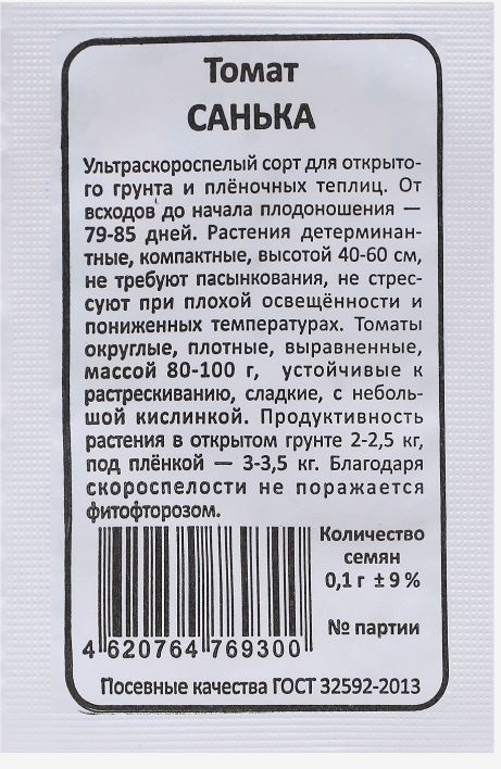 Ультраскороспелый (85-96 дней) сорт для открытого грунта и пленочных укрытий. Растение компактное, высотой 30-40 см. Требует умеренного пасынкования или не пасынкуется. Плоды округлые, красные, слаборебристые, массой 80-100 г. Ценность сорта: обладает комплексной устойчивостью к болезням, раннее дружное плодоношение. Рекомендуется для употребления в свежем виде, цельноплодного консервирования и переработки на томатопродукты.