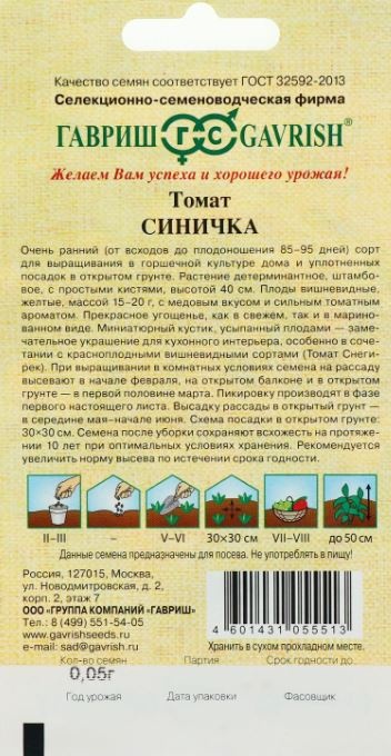 «Синичка» — это раннеспелый сорт помидоров для выращивания в горшках и открытом грунте. Техническая спелость наступает на 85–95-й день от всходов. Высота растения составляет 40 см.