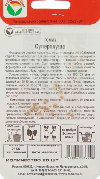 Среднеранний, начало созревания плодов на 100-105 день от появления всходов. Куст штамбовый, стебель толстый, устойчивый, высотой до 30-40 см, в рассаде не вытягивается. Плоды округлые, розовые, массой 150-250 грамм, спрятаны под листья, хорошо вызревают в открытом грунте. Томаты универсального назначения, вкусны как в свежем, так и в консервированном виде. Урожайность сорта до 10 кг/м2. Компактная корневая система, позволяет выращивать на единице площади больше растений. Подходит для выращивания в горшках. В наших условиях можно высаживать на зиму при наличии дополнительной подсветки.
