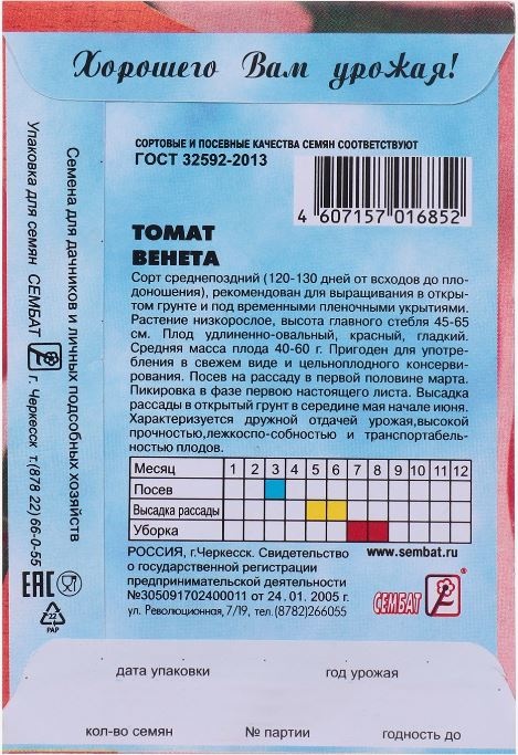 Среднепоздний сорт томата. Плодоносить начинает через 120-130 дней после появления всходов. Растение низкорослое, высота главного стебля 45…65 сантиметров. Плод удлиненно-овальный, красный, гладкий. Средняя масса плода 40…60 граммов. Пригоден для употребления в свежем виде и цельноплодного консервирования. Характеризуется дружной отдачей урожая, высокой прочностью, лежкоспособностью и транспортабельностью плодов.