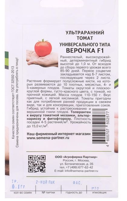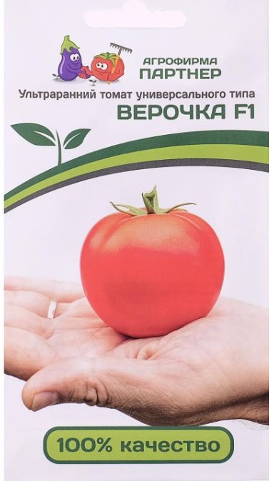 ибрид раннеспелый, детерминантный, высотой до 1 м. От всходов до первого сбора урожая 85-90 дней.  Первое соцветие закладывается над 6- 7 листом, последующие через 2. Соцветия полусложные. В соплодии, как правило, развивается около 5-и полноценных плодов. Плоды 4-5-ти камерные, с хорошими пропорциями семенных камер и толщины стенок, округлой формы, слегка граненые у плодоножки, фактура напоминает  нежные детские щёчки. Томаты густо-красного цвета, очень красивые, кожица тонкая, прочная, блестящая.  Масса плодов от 110 до 150 г. Вкус приятный, сладкий, с небольшой кислинкой, очень хороший для скороспелых томатов. Томаты пригодны, как для потребления ранней продукции в свежем виде, так и для приготовления консервов и соков. Гибрид устойчив к растрескиванию и вершинной гнили плодов, толерантен к вирусу томатной мозаики, альтернариозу и фитофторозу.