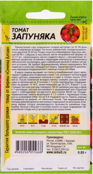 В марте семена высевают на слегка утрамбованный грунт, мульчируют торфом или почвенным слоем 1 см, поливают теплой водой через ситечко, накрывают пленкой и ставят в теплое (около 25°С) место. После появления всходов пленку снимают, рассаду размещают в светлом месте. В течение 5-7 суток температуру поддерживают на уровне 15-16°С, затем повышают до 20-22°С. В фазе 1-2 настоящих листьев рассаду пикируют. 60-65-дневную рассаду в фазе 6-7 настоящих листьев высаживают в защищенный или открытый грунт с соблюдением посадочного расстояния 40х40 см. Полудетерминантные томаты формируют в 1-2 стебля с переводом точки роста на боковой побег после 6-8 плодовой кисти. Томаты хорошо отзываются на редкий, но обильный полив. При выращивании в теплице рекомендованы магниевые подкормки по вегетации. В период налива плодов рекомендуется произвести калийную подкормку. Урожай собирают в течение сезона по мере созревания. Недозревшие плоды могут дозариваться не на растении.