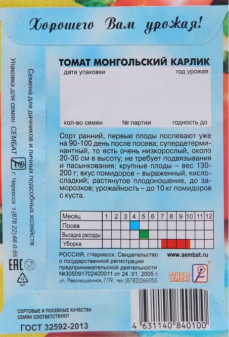 Семена высеивают на глубину 1-2 см. Оптимальная температура для прорастания семян 22-25 0С. Сеянцы пикируют в фазе первого настоящего листа. Уход за растениями заключается в поливах по мере необходимости (особенно важно поливать томаты перед цветением, с появлением завязей и начале созревания плодов), прополках, рыхлении, подкормках.Томат Монгольский карлик относится к группе самых ранних и низкорослых томатов. Плоды достаточно крупные, весом до 200 гр., красного цвета, мясистые и сбалансированные по вкусу. Не требует пасынкования и подвязки. Супердетерминантный сорт для открытого грунта. Высота всего около 30см и примерно 1м в диаметре. Когда ствол достигает 20-30 см, он начинает резко изгибаться вниз. Куст стелется, образуя несколько хорошо развитых побегов. Растение отличается особо крепкой корневой системой, которая расположена близко к поверхности земли. На основном стебле после его высадки в грунт начинает формироваться большое количество пасынковых отростков, на которых в дальнейшем будет по 3-4 плода средней величины. Куст нельзя подвязывать к опорам. Сорт устойчив к фитофторозу. Плоды могут долго сохранять свой товарный внешний вид и не трескаться даже находясь на ветке в условиях влажного климата. Высокая урожайность сорта – около 10 кг помидоров с одного куста!