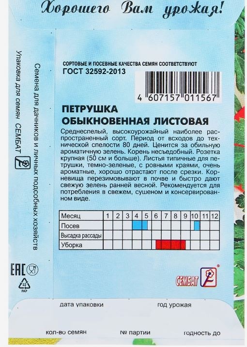 Семена петрушки высевают в несколько сроков. Весной семена высевают в конце апреля-начале мая, под зиму в октябре-ноябре, летом - в конце июня. Под зиму семена высевают сухими. Весной семена петрушки сеют в увлажненные бороздки. Между растениями выдерживают расстояние в 3-4 сантиметра, между рядками соблюдают расстояние в 20-30 сантиметров. Сверху посевы мульчируют торфом. Посевы укрывают для быстрого прорастания семян. Пленку убирают при появлении первых всходов. Петрушку необходимо прореживать, пропалывать и поливать. Уборку листьев производят периодически, по мере необходимости.
