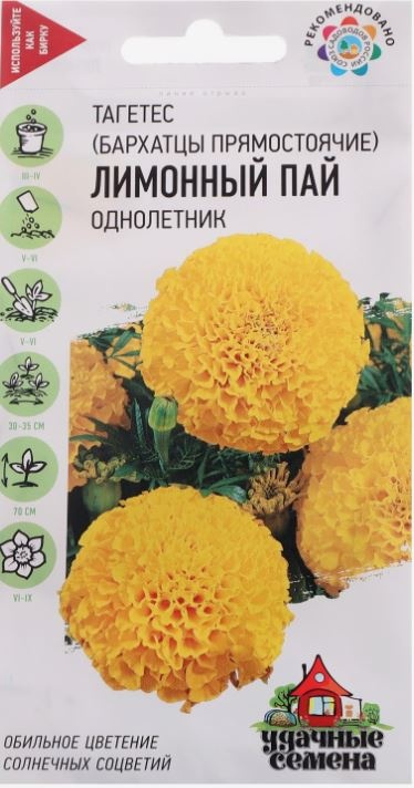 Соцветия крупные (8-10 см в диаметре) густомахровые, шаровидные, лимонно-желтой окраски. Цветет продолжительно, с июня по сентябрь. Бархатцы светолюбивы и теплолюбивы, засухоустойчивы.