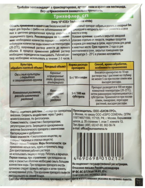 Рассада цветочных растений и комнатные цветочные растения – 5 г/500 мл субстрата. Препарат разводится в 100 мл воды, перемешивается с субстратом. Применяется при посеве семян, пикировке, пересадке, высадке рассады.