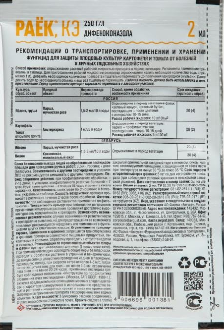 Способ применения: для приготовления рабочей жидкости расчётную дозировку препарата растворить в небольшом объёме воды и довести объем рабочего раствора до 10 л. Рабочую жидкость следует готовить непосредственно перед опрыскиванием и использовать полностью в тот же день.