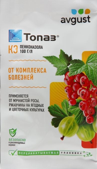 Топаз 100 ЕС к.э. - высокоселективный фунгицид по борьбе с мучнистою росою. Действующее вещество: пенконазол. Топаз 100 оказывает сильное профилактическое, лечебное и искореняющее действие. Его применяют для лечения черной смородины, малины, винограда, огурцов, персика, яблони, вишни. Малотоксичен, не опасен для людей и окружающей среды, но пчелам контактировать с растениями можно не раньше чем через 24 часа после опрыскивания. Препарат после опрыскивания быстро поглощается растениями, что снижает риски смывания дождем.