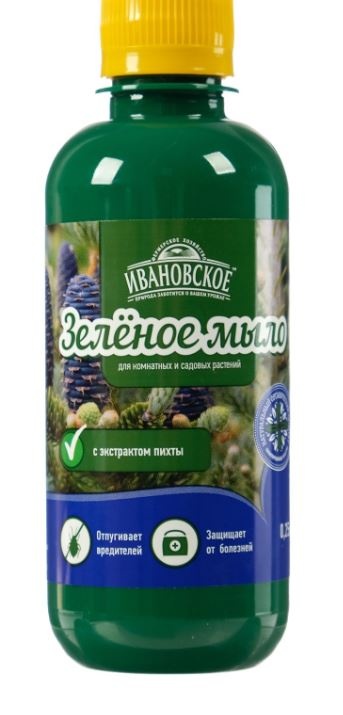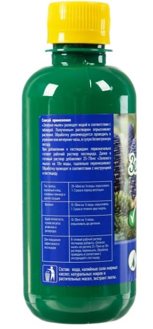 - Для повышения эффективности пестицида в готовый его раствор добавить «Зелёное мыло» из расчёта 25–75 мл на 10 л раствора, перемешать. Обработку проводить в соответствии с инструкцией к пестициду.