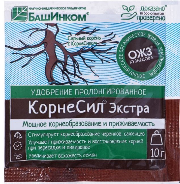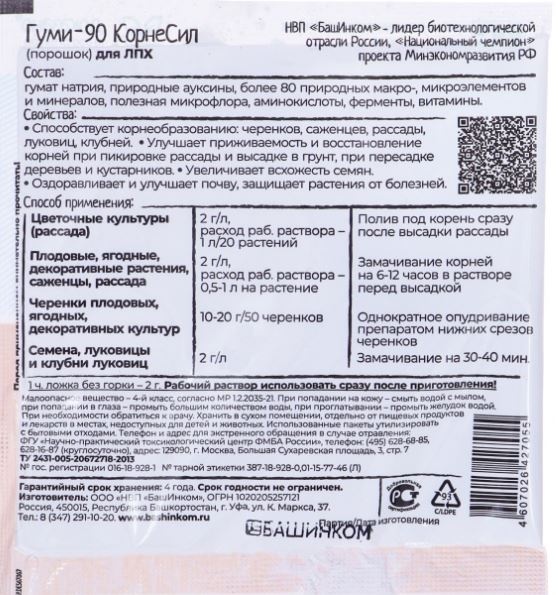 Способствует корнеобразованию: черенков, саженцев, рассады, луковиц. Улучшает приживаемость и восстановление корней при пикировке и высадке в грунт рассады, при пересадке деревьев, кустарников. Увеличивает всхожесть семян.Преимущества:Мощно стимулирует корнеобразование черенков, саженцев. Улучшает приживаемость и восстановление корней при пересадке и пикировке. Увеличивает всхожесть семян. Обладает пролонгированным действием. Соответствует технологии Органического живого земледелия, безопасен для человека и животных.Состав препаратаГумат натрия – 3 %, более 80 природных полезных макро-, микроэлементов и минералов, полезная микрофлора, природный ауксин.Защищаемые культурыВсе садовые, огородные и цветочные растения.Меры безопасностиПри попадании на кожу – смыть водой с мылом, при попадании в глаза – промыть большим количеством воды при проглатывании – промыть желудок водой, при необходимости обратиться к врачу.Условия транспортирования и храненияХранить в сухом помещении, отдельно от пищевых продуктов и лекарств, в местах, недоступных для детей и животных. Использованные пакеты утилизировать с бытовыми отходами. Гарантийный срок хранения: 4 года.Технология применения:- Цветочные культуры, рассада: Полив под корень сразу после высадки рассады, 2 г/л, расход раствора – 1 л/20 растений.- Плодовые, ягодные и декоративные растения, саженцы, рассада: Замачивание корней на 6-12 часов в растворе перед высадкой, 2 г/л, расход раствора 0,5–1 л на растение.- Черенки плодовых, ягодных и декоративных культур: Однократное опудривание препаратом нижних срезов черенков, 10–20 г/50 черенков.Рабочий раствор использовать сразу после изготовления