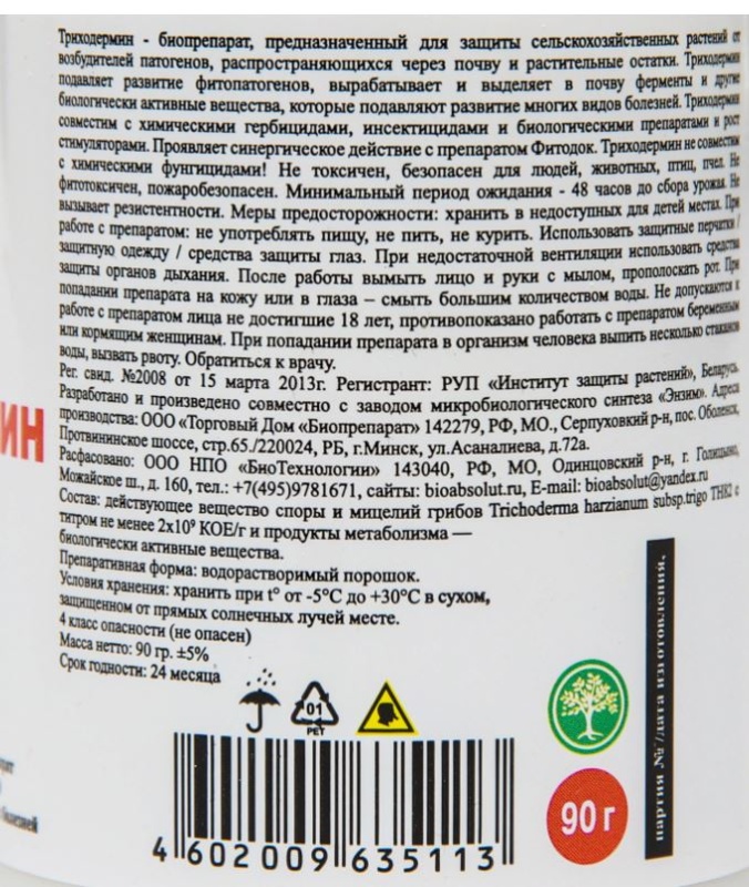 Высокоэффективный биологический препарат для борьбы с широким спектром возбудителей грибных и бактериальных заболеваний растений на основе спор и мицелия грибов Trichoderma harzianum subsp. trigo. Подавляет развитие фитопатогенов прямым паразитированием, конкуренцией за субстрат, выделением ферментов, антибиотиков (глиотоксин, виридин, триходермин) и других биологически активных веществ. Подавляет патогенных возбудителей, распространяющихся через почву и растительные остатки.